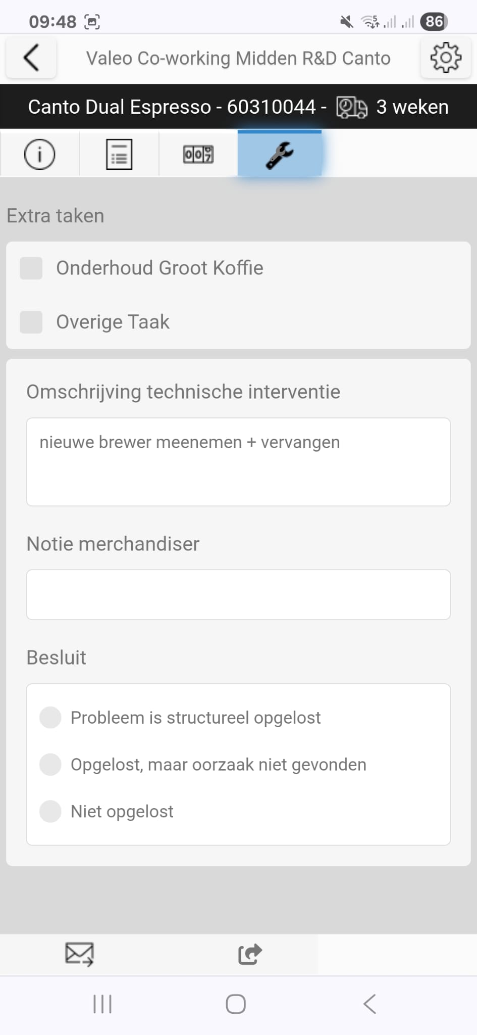 Wanneer de planning een e-mail van een klant of een opmerking van een merchandiser ontvangt m.b.t. een technische storing zullen zij dit toewijzen aan een merchandiser of technieker om deze storing te gaan oplossen. Dit verschijnt in de Mastervending app als een taak 'Technische interventie'. Deze taken zijn prioritair te behandelen en krijgen dus voorrang op aanvultaken.