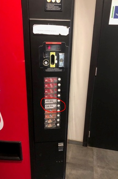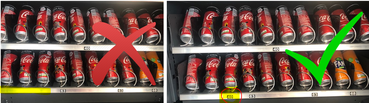 - Een spiraalautomaat waarbij selecties gegroepeerd staan, wordt steeds duidelijk aangegeven me voldoende selectienummers zodat zowel de consument als de aanvuller steeds 100% zekerheid weet welke smaak waar zit. In onderstaand geval was dit niet goed aangegeven waardoor er Coca Cola werd aangevuld in een selectie die voorzien was voor Coke Zero
