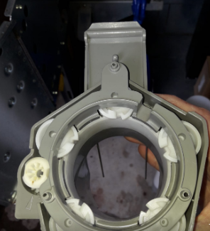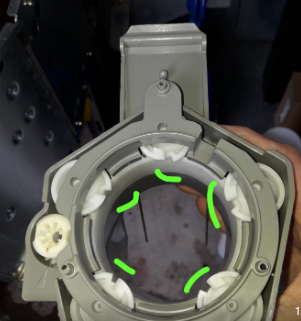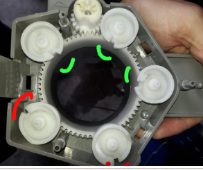 - Grijze ring die wieltjes op hun plaats houdt eraf halen. Op onderstaande foto'z met rode markering zitten de wieltjes fout!